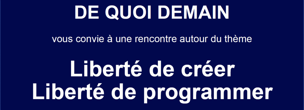 L’association DE QUOI DEMAIN a pour objet la revitalisation, à partir du champ artistique, d’une culture pour tous, universaliste, librement créée, collectivement libératrice. Ses membres, humanistes, républicains, démocrates, attachés à la laïcité, soucieux de lutter pour la justice sociale et l’égalité hommes-femmes, contre l’homophobie, contre le racisme et l’antisémitisme, ont à cœur de favoriser un large dialogue autour du rôle émancipateur de l’art et des formes qui peuvent être aujourd’hui les siennes.